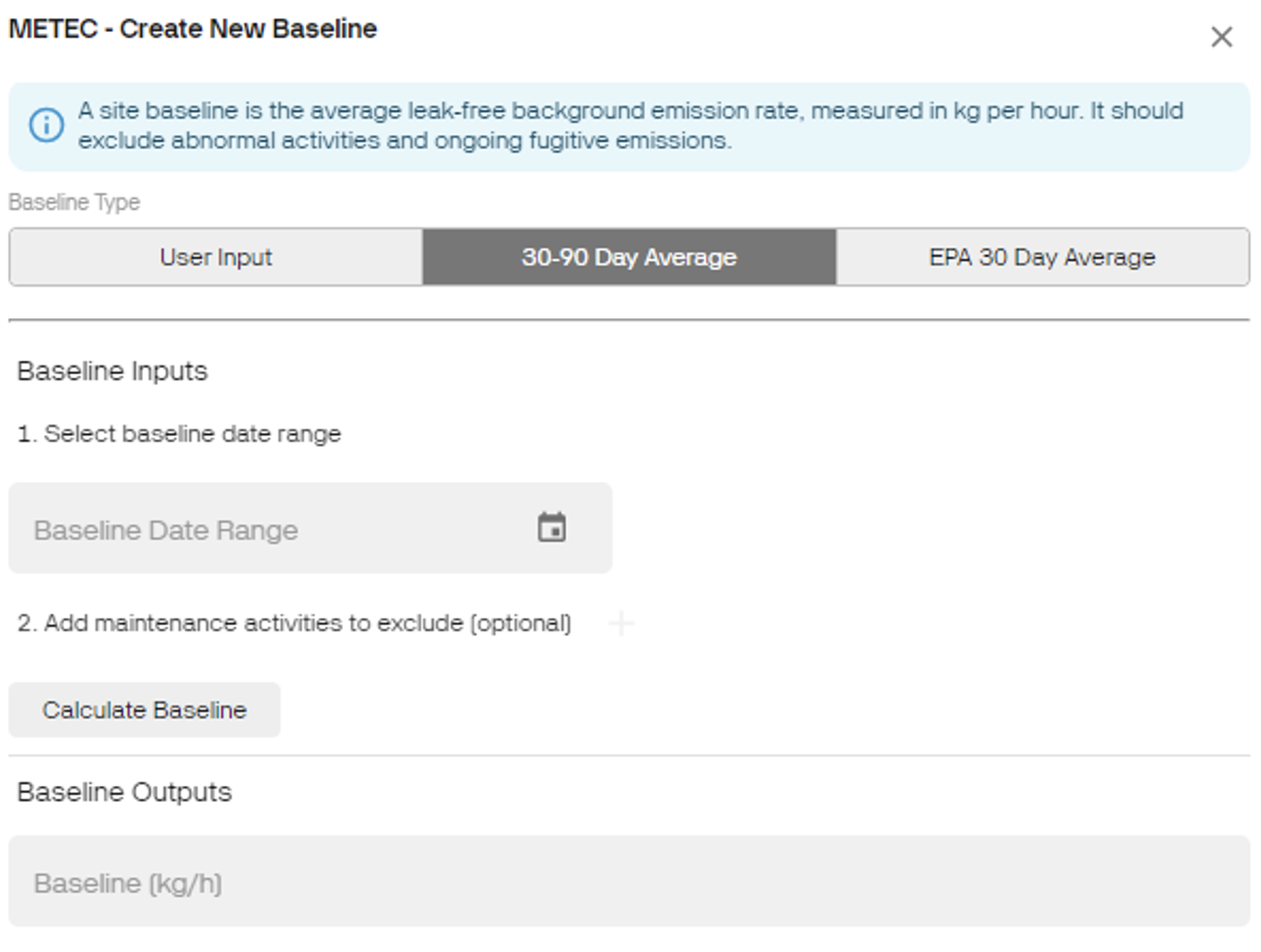 Site Baselines: Improve your monitoring and managing of emissions using the Site Baselines Feature! Calculate your site's baseline using a yearly inventory, a 30 to 90-day average, or an EPA-compliant 30-day average. Set a specific baselining period that complies with EPA OOOOb/c. Easily spot over-emitting sites by comparing emissions against their baseline on the Emission Trends page or Site Dashboard..
